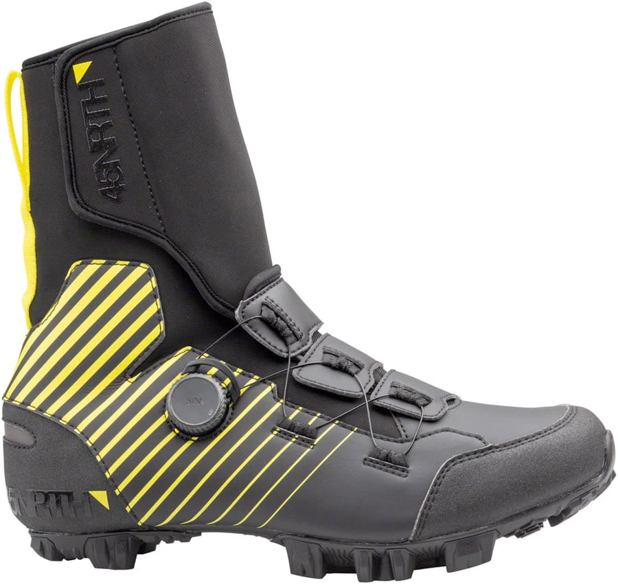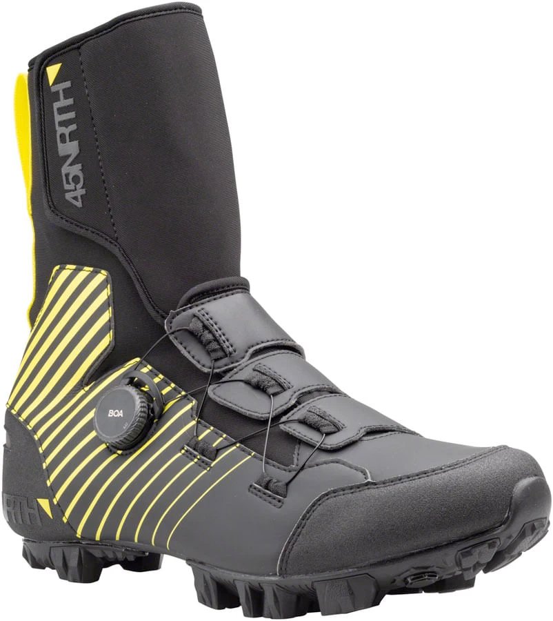 The 45NRTH Ragnarök Tall Winter Cycling Boot is the remedy for cool and wet conditions. This shoulder-season performance shoe features a waterproof membrane and tall neoprene cuff to regulate moisture and keep out mud and grit. A redesigned opening makes Ragnarök easy to put on and take off, and a floating three-finger overflap allows riders to dial in the perfect fit. Ragnaröks real rubber outsole has an aggressive tread for walking in mud and features a 2-bolt cleat mount. End uncomfortable rides with Ragnaröks unrivaled weather protection.