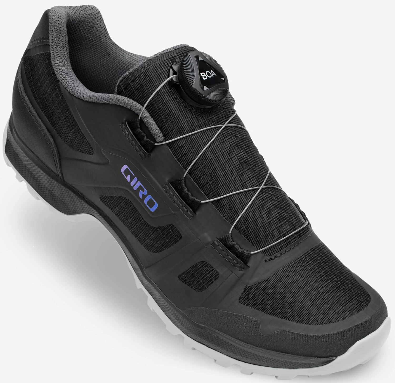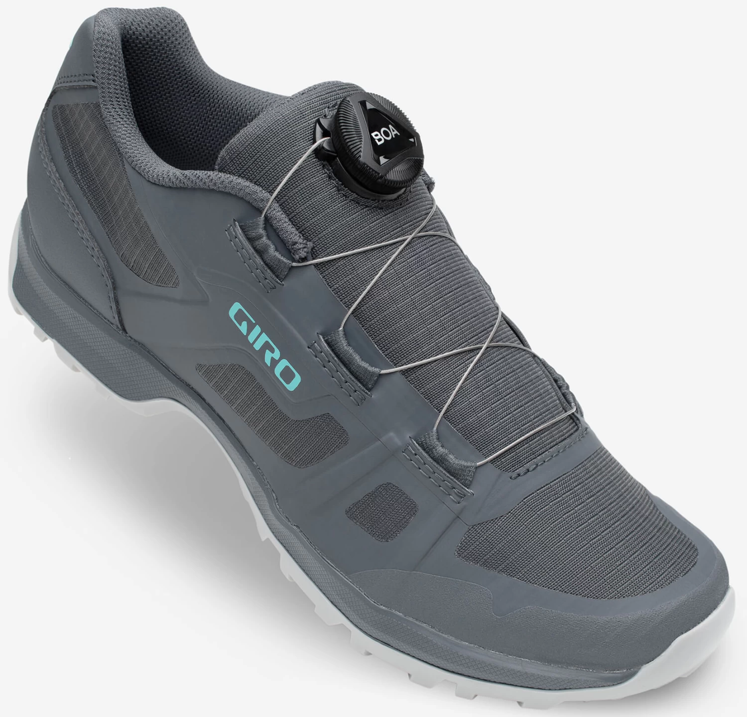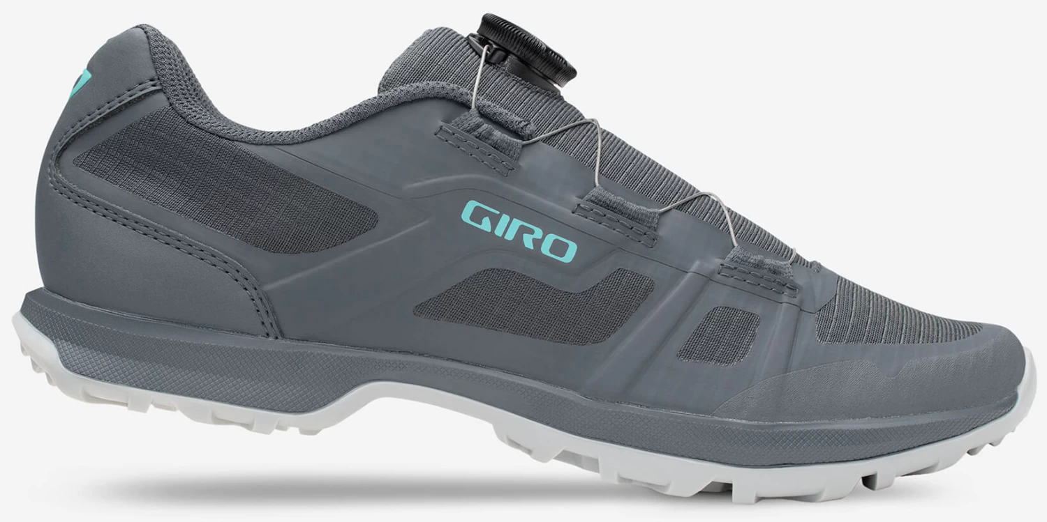 The 2022 Giro Gauge BOA Women’s Shoe combines cycling-specific features, like clipless pedal compatibility and supportive fit, with the reliable grip of an aggressively lugged rubber outsole and the feel of a trail running shoe. The fit is secure thanks to a BOA micro-adjustable buckle, while reinforced heel and toe boxes offer protection from scrapes and impacts. With an upper made from supple synthetic fiber and breathable mesh and a stout injected-nylon inner shank to help transfer your power to the pedals, it gives you the confidence to take on any trail.