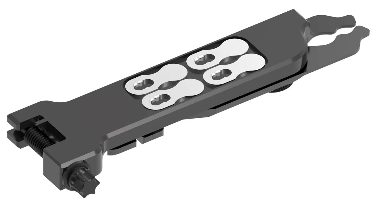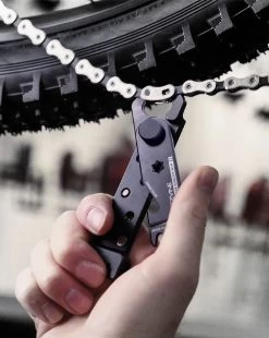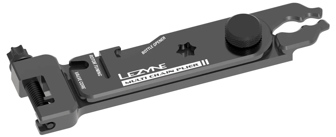 Professional grade, versatile bike chain multi tool engineered for a variety of road or trailside repairs. The Lezyne Multi Chain Pliers are constructed from machined aluminum and feature an integrated quick-link tool, chain breaker, valve core tool, bottle opener, rotor aligner and magnetic holders for up to two spare quick links. Its slim design allows for maximum portability, and it’s engineered for long-lasting use. It also features an anodized finish and a hardened steel chain breaker pin. Mountain bikers, road cyclists and gravel grinders will all find its versatility highly useful, whether in the workshop or out on the road or trail.
