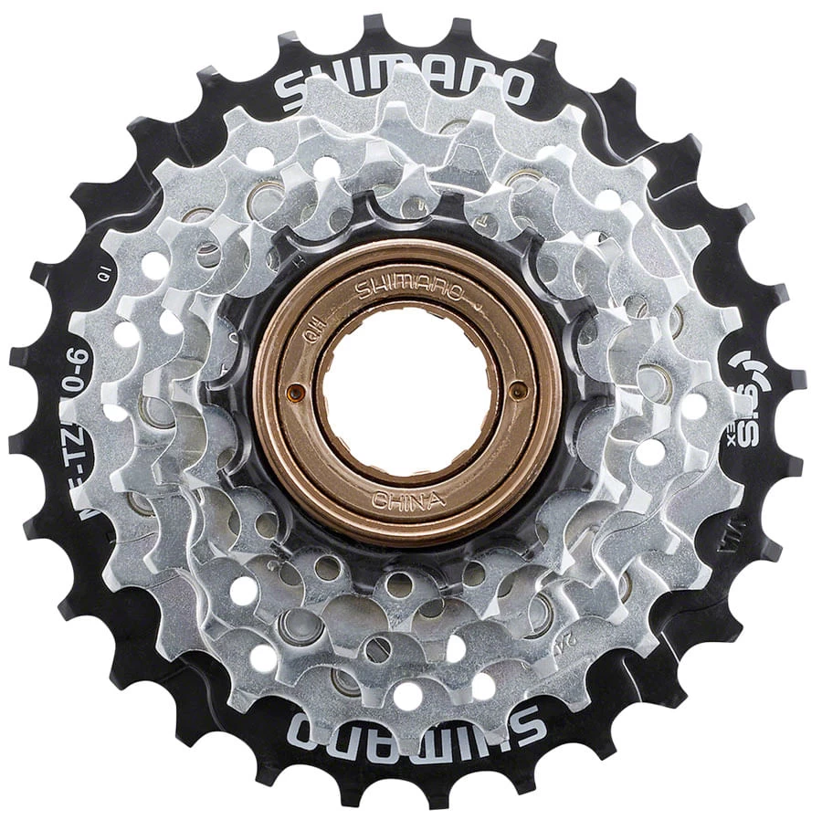 The Shimano MF-TZ510-6-CP Multi-Speed Freewheels has 6 cogs and includes a spoke protector.