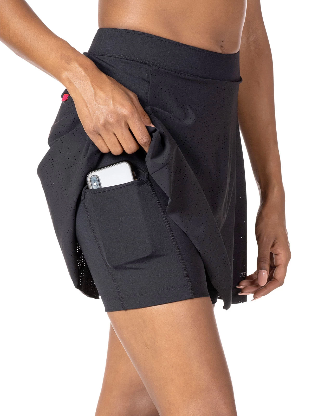 - Nylon/spandex perforated skirt in chevron pattern is cool, lightweight and super ventilating